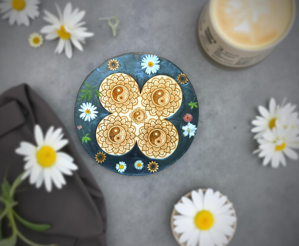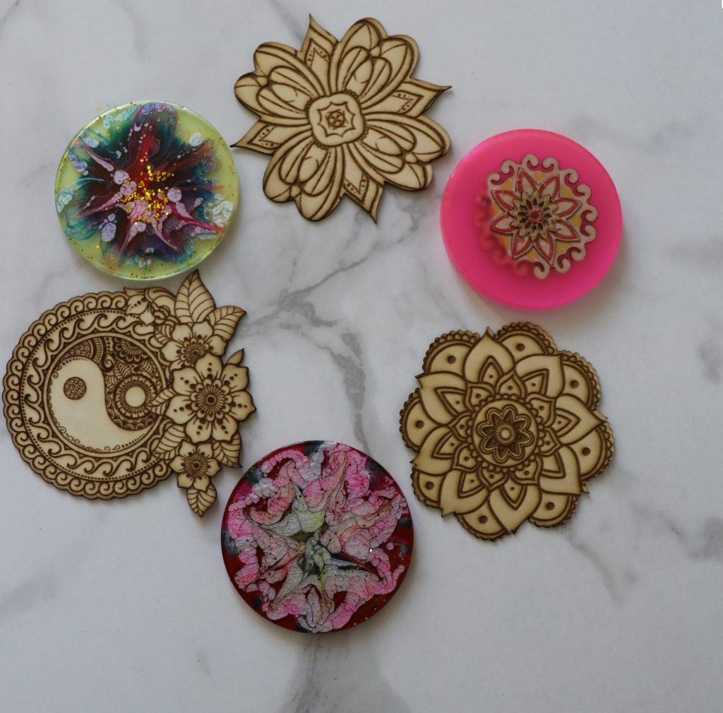 Explore our gallery featuring exquisite resin coasters, trays, and accents crafted with laser precision.